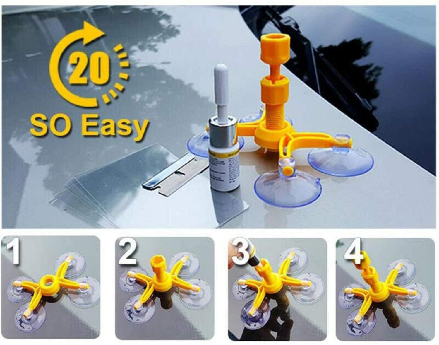 Cracked Glass Repair Kit is designed to repair glass damages including bulls-eye, cracks, spider web, star damages, and some combination breaks only in 20 minutes.
